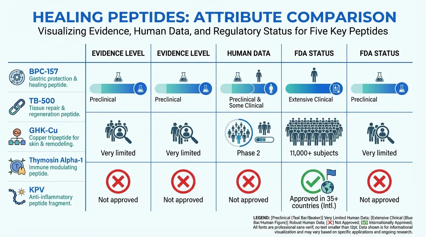 Evidence quality varies dramatically -- from Thymosin Alpha-1's 11,000+ human subjects to KPV's entirely preclinical record. Researchers should weight their evaluations accordingly.