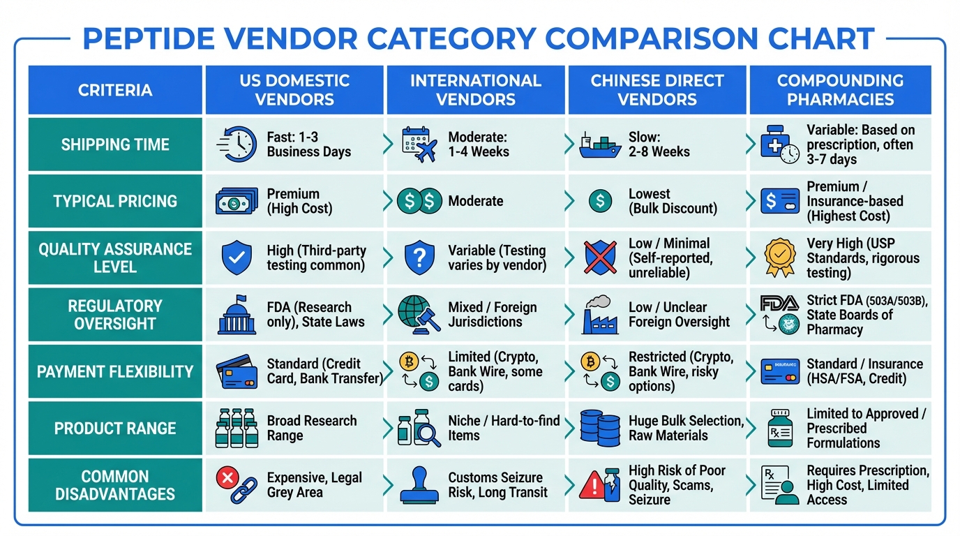 Compounding pharmacies operate under FDA oversight and follow USP quality standards. They require a physician prescription and offer the highest quality assurance of any vendor category.