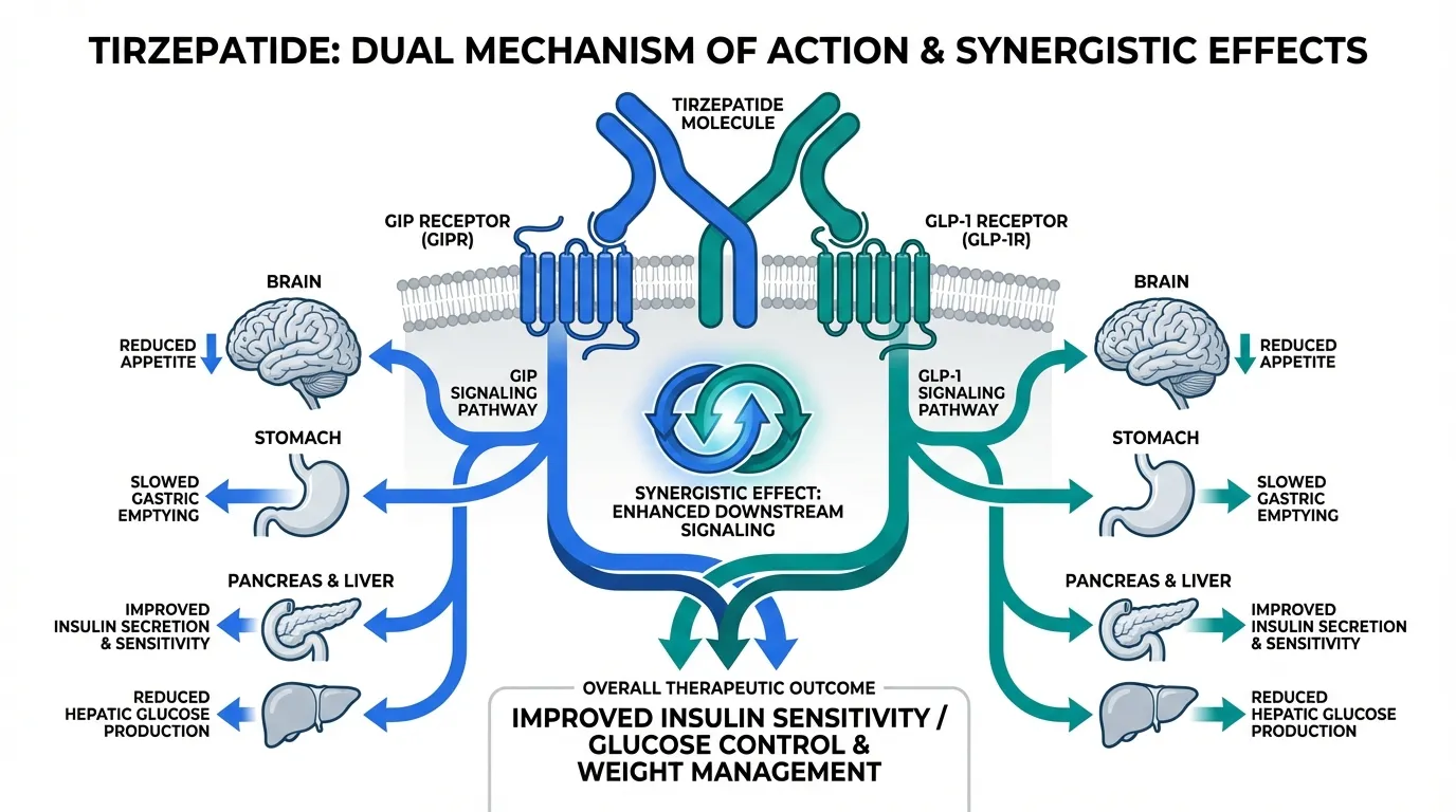 Tirzepatide activates both GIP (glucose-dependent insulinotropic polypeptide) and GLP-1 (glucagon-like peptide-1) receptors. This dual mechanism reduces appetite through hypothalamic signaling, slows gastric emptying, and improves insulin sensitivity.