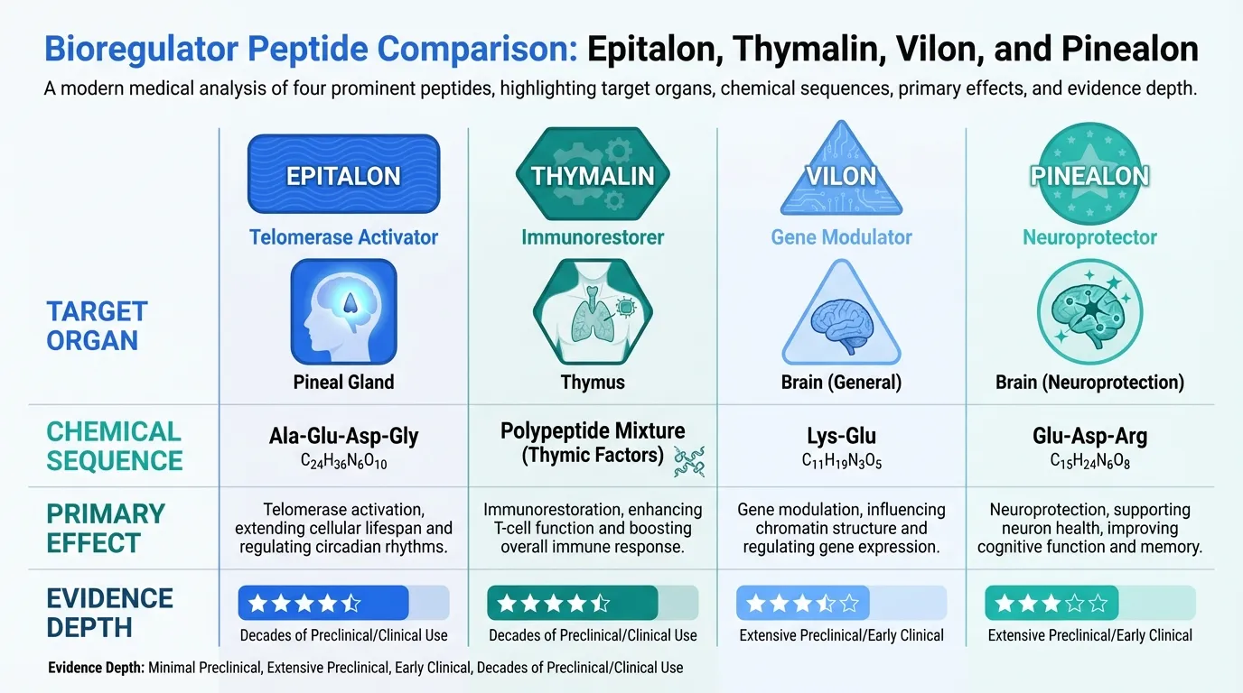 | Feature | Epitalon | Thymalin | Vilon | Pinealon |