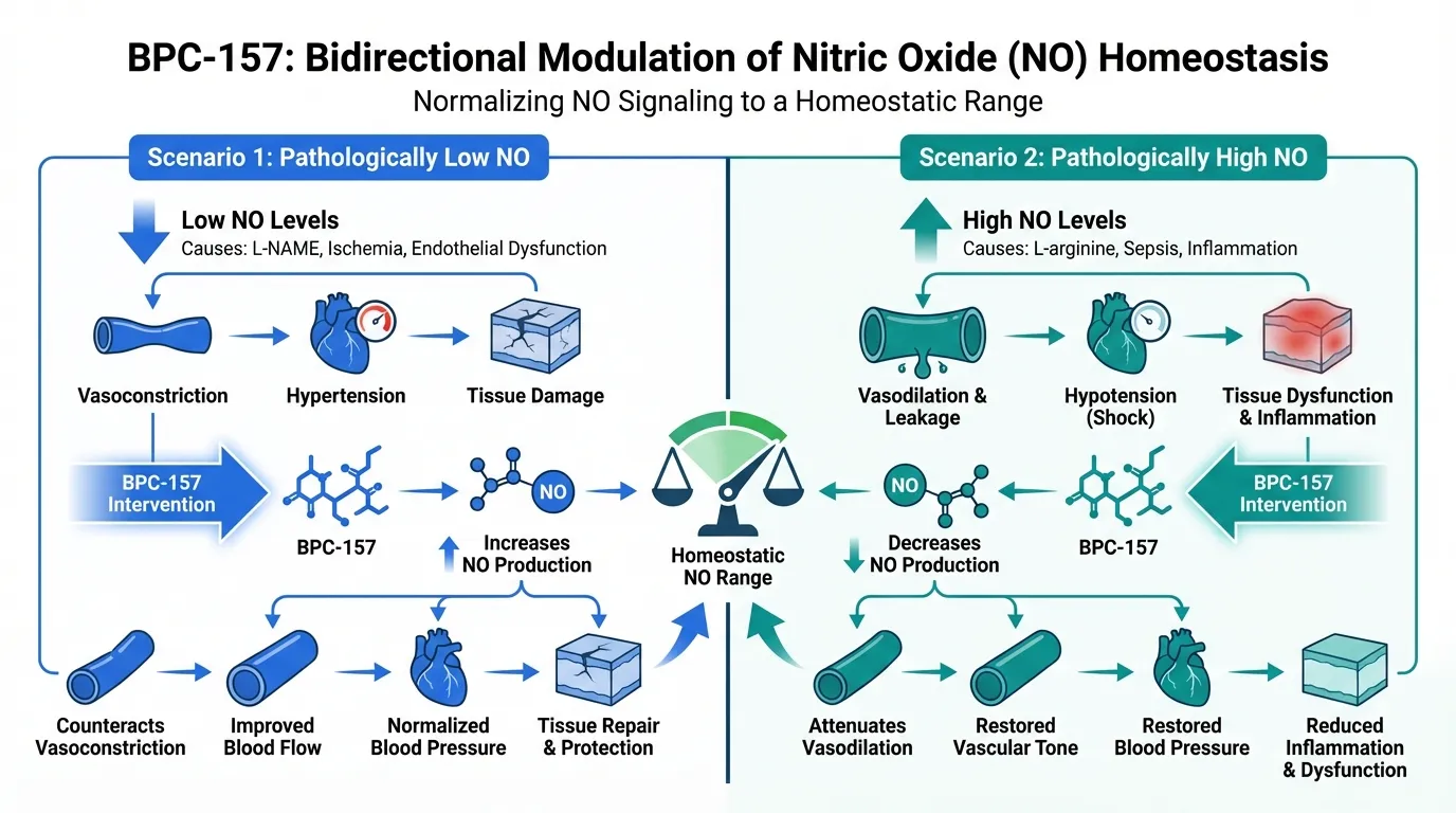 BPC-157's interaction with the nitric oxide (NO) system is perhaps its most distinctive mechanistic feature. Unlike drugs that simply increase or decrease NO levels, BPC-157 demonstrates bidirectional modulation -- normalizing NO signaling regardless of the direction of the perturbation.