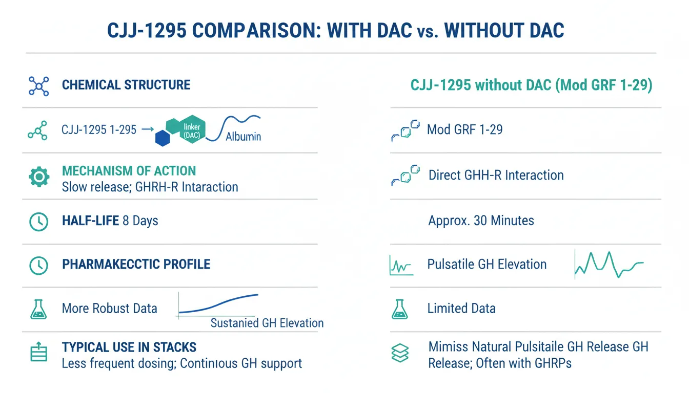 DAC vs. no-DAC distinction matters. Most published CJC-1295 clinical data is for the DAC version, which has fundamentally different pharmacokinetics than the no-DAC variant used in this stack.