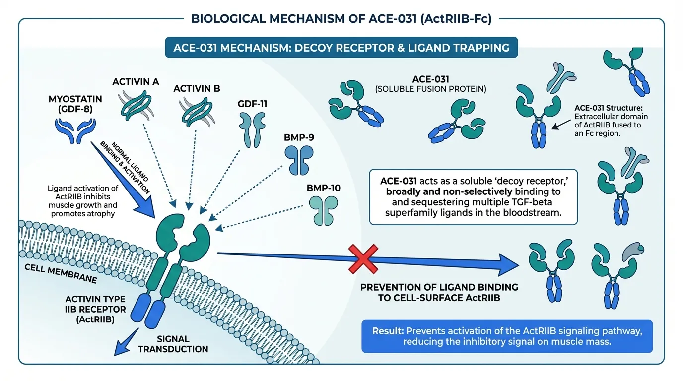 ACE-031 is a soluble fusion protein combining the extracellular domain of the activin type IIB receptor (ActRIIB) with the Fc region of human IgG1. This construct circulates in the bloodstream and acts as a decoy receptor, binding and sequestering TGF-beta superfamily ligands before they can reach cell-surface receptors.