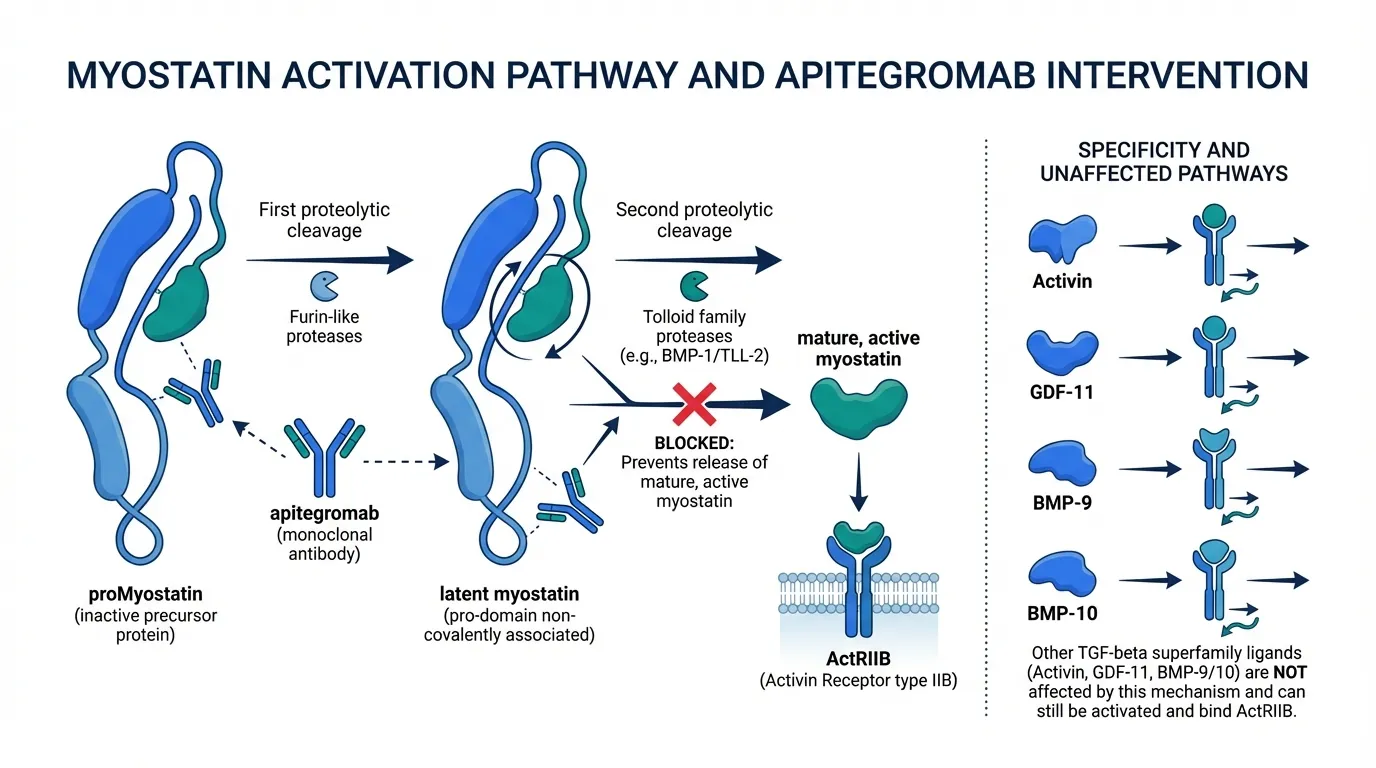 Apitegromab takes a fundamentally different approach. Rather than blocking the receptor or trapping mature ligands, apitegromab is a monoclonal antibody that binds to proMyostatin and latent myostatin, the inactive precursor forms of myostatin.