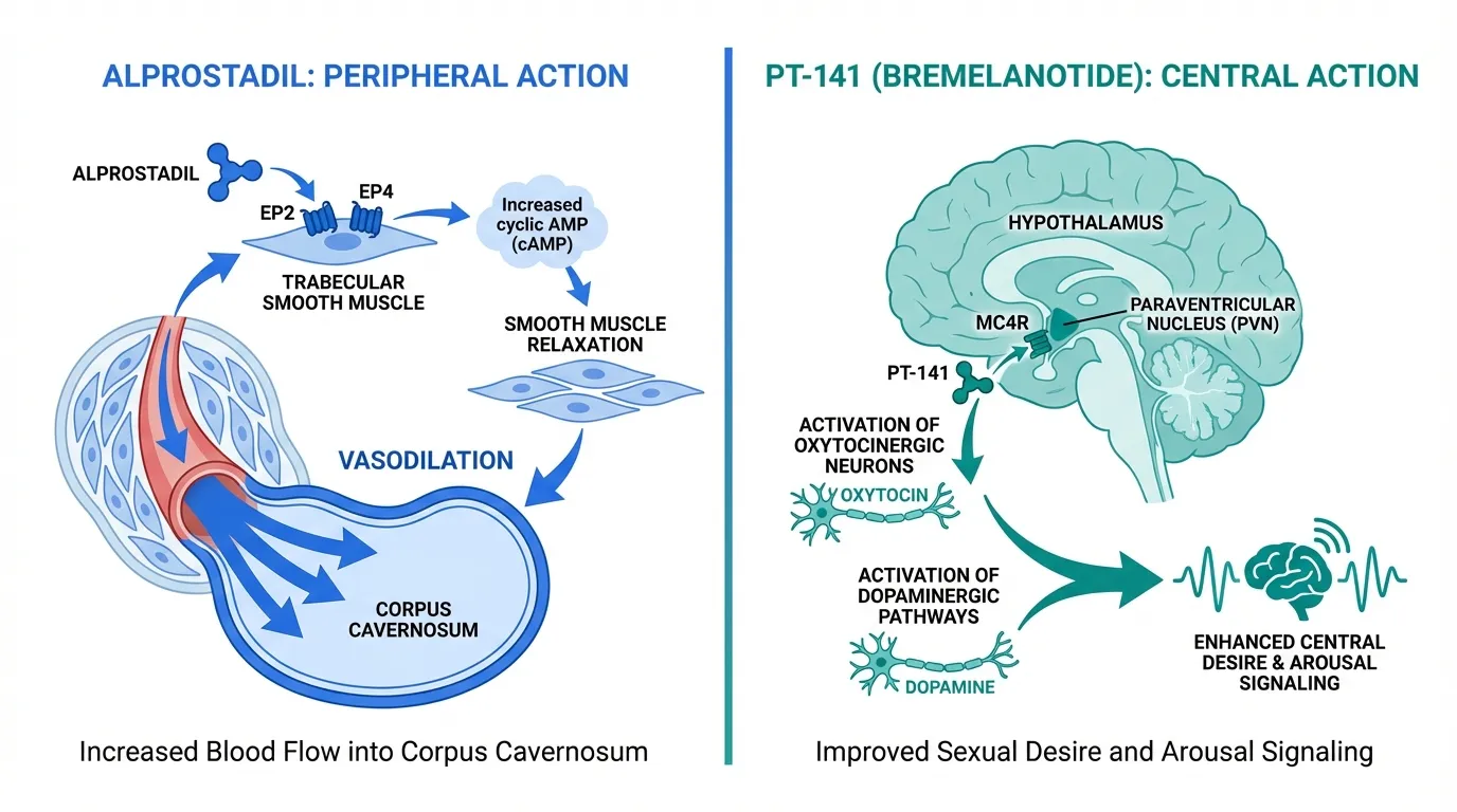 Alprostadil vs PT-141: Peripheral Vasodilator vs Central Desire Pathway