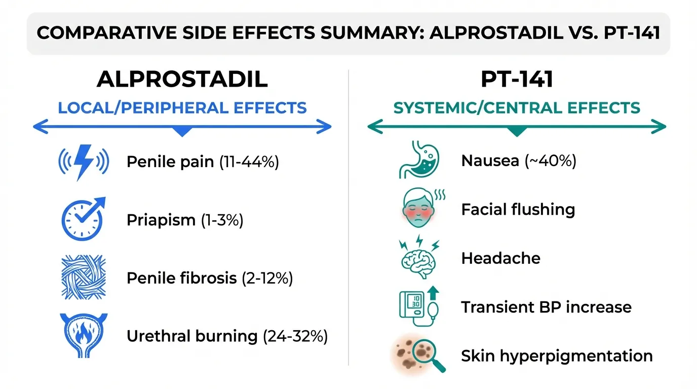 The side effect profiles are almost entirely non-overlapping, reflecting the different mechanisms and routes of administration. Alprostadil's risks are predominantly local (injection site pain, priapism, fibrosis) while PT-141's risks are predominantly systemic (nausea, BP changes). Neither compound has significant drug-drug interactions with PDE5 inhibitors, though combining alprostadil with PDE5 inhibitors requires careful dosing to avoid prolonged erection.