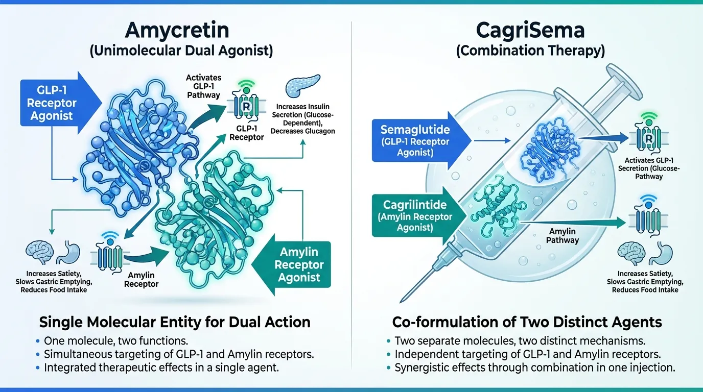 Amycretin and CagriSema represent two approaches to the same therapeutic concept: combining GLP-1 receptor agonism with amylin receptor agonism for obesity and diabetes treatment. Both are Novo Nordisk programs, but they employ fundamentally different molecular strategies. CagriSema is a fixed-ratio combination of two separate peptides (cagrilintide + semaglutide) delivered as a single weekly injection. Amycretin is a unimolecular dual agonist -- a single molecule that activates both GLP-1 and amylin receptors -- available in both injectable and oral formulations.
