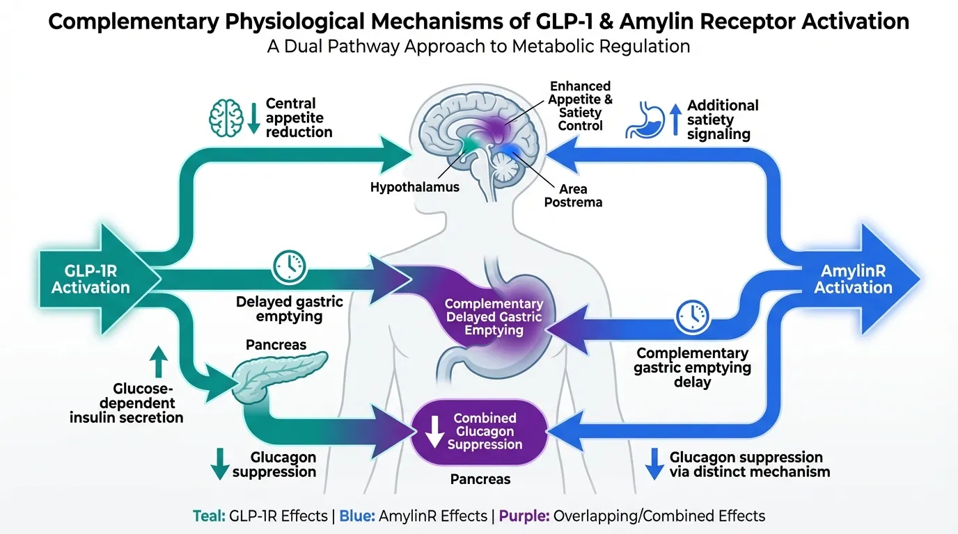 - Amylin receptor activation: Additional satiety signaling through the area postrema, complementary gastric emptying delay, and glucagon suppression through a distinct mechanism