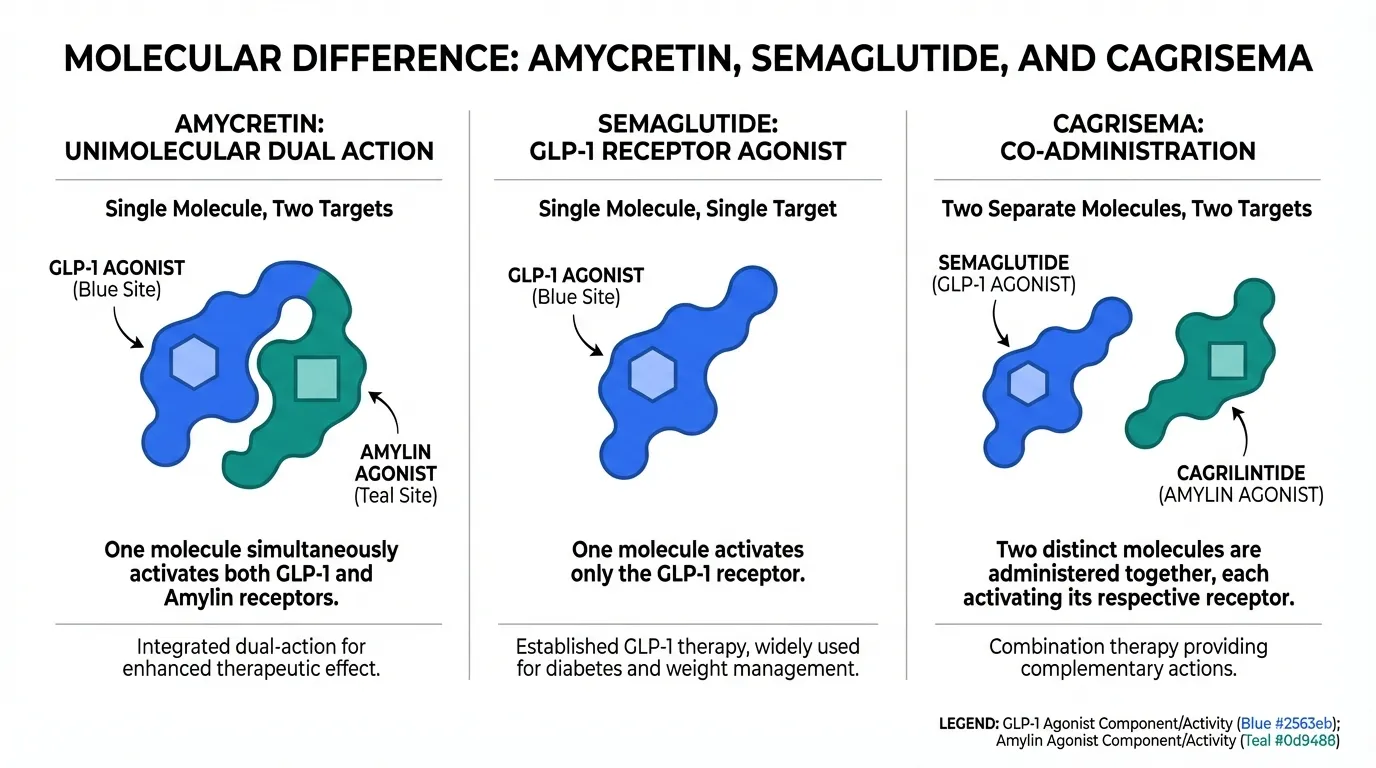 | Mechanism of Action | Unimolecular dual GLP-1 and amylin receptor agonist. A single molecule that activates both pathways simultaneously. Available as both subcutaneous (weekly) and oral (daily) formulations. | Selective GLP-1 receptor agonist. Activates GLP-1 receptors only. Available as injectable (Ozempic/Wegovy, weekly) and oral (Rybelsus, daily with fasting restrictions). | Amycretin |