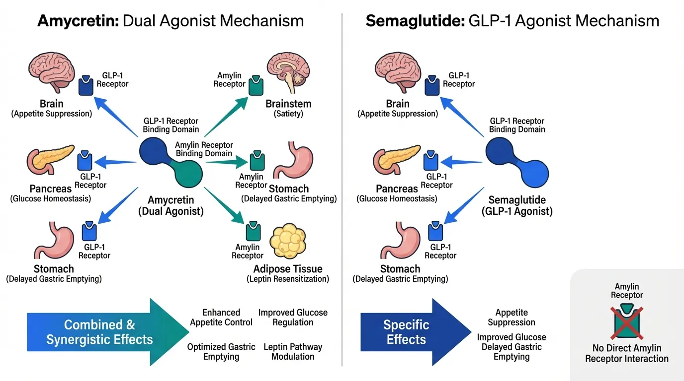 Amycretin is a unimolecular agonist that simultaneously activates both GLP-1 and amylin receptors through a single peptide. The GLP-1 component provides appetite suppression and glucose homeostasis. The amylin component adds brainstem-mediated satiety, gastric emptying delay, and leptin resensitization. Unlike CagriSema, both activities are built into one molecule.
