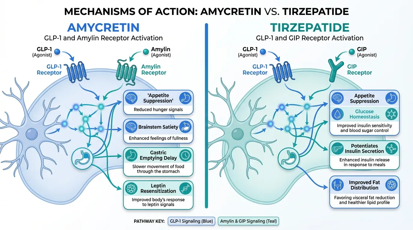 Both combine GLP-1 agonism with a second pathway, but the complementary mechanisms differ fundamentally: amycretin pairs GLP-1 with amylin receptor agonism, while tirzepatide pairs GLP-1 with GIP receptor agonism.