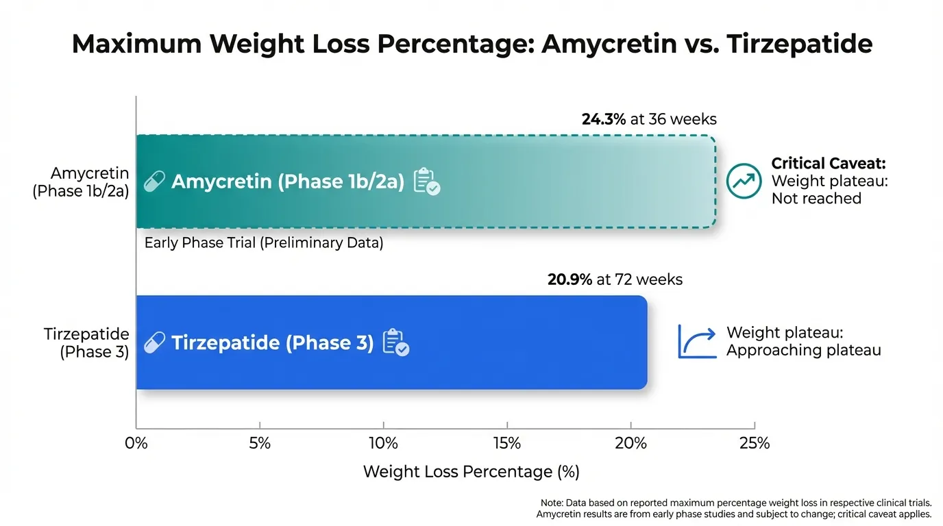 Amycretin's early-phase data (24.3% weight loss at 36 weeks, no plateau) suggest it could substantially exceed tirzepatide's 20.9%, potentially becoming the most effective anti-obesity agent ever tested. However, this comparison is fundamentally unequal: amycretin's results come from 125 patients over 36 weeks, while tirzepatide's come from thousands of patients over 72 weeks in rigorous Phase 3 trials. Early-phase weight loss often diminishes in larger trials. Tirzepatide is FDA-approved and available today. Amycretin's promise must be confirmed in Phase 3 before definitive conclusions can be drawn.
