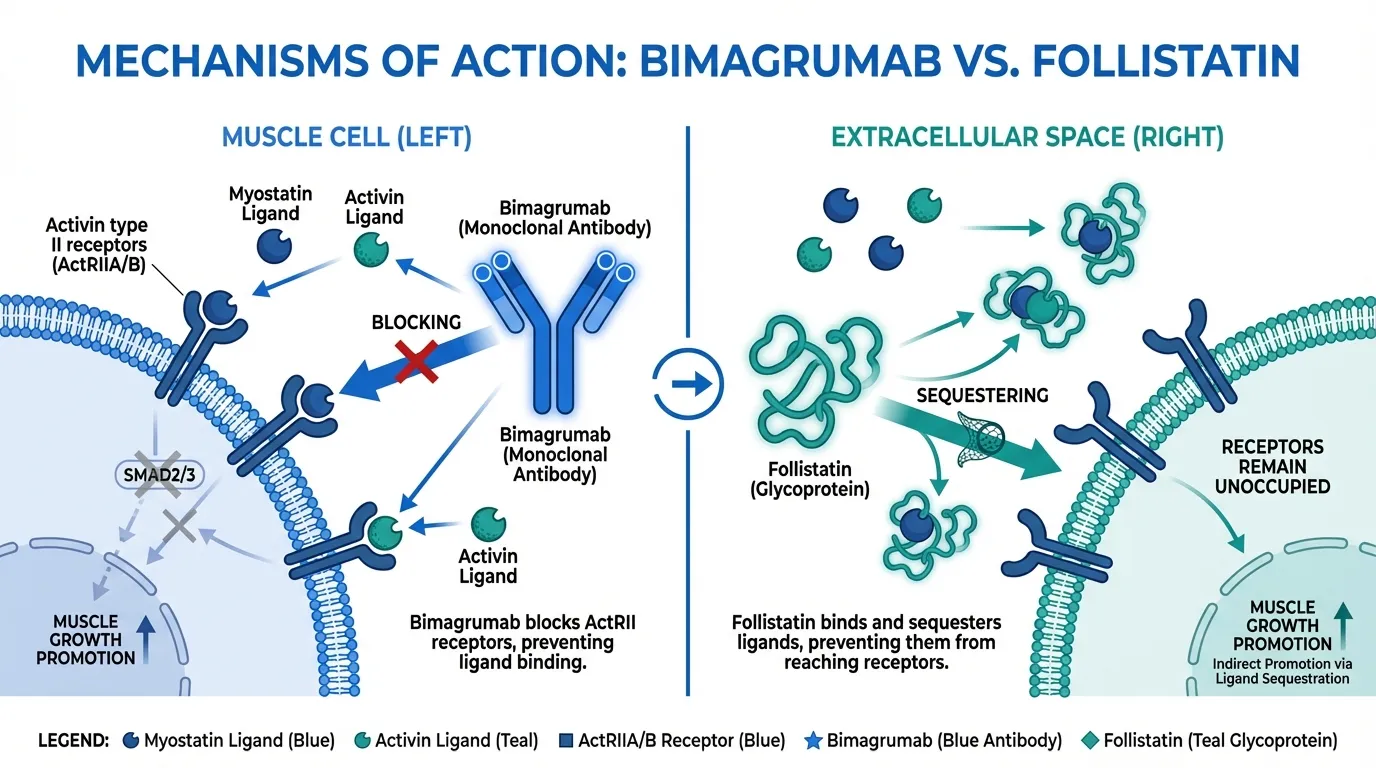 - Mechanism level: Bimagrumab blocks at the receptor level (broad). Follistatin sequesters ligands in the extracellular space (also broad, but naturally regulated).