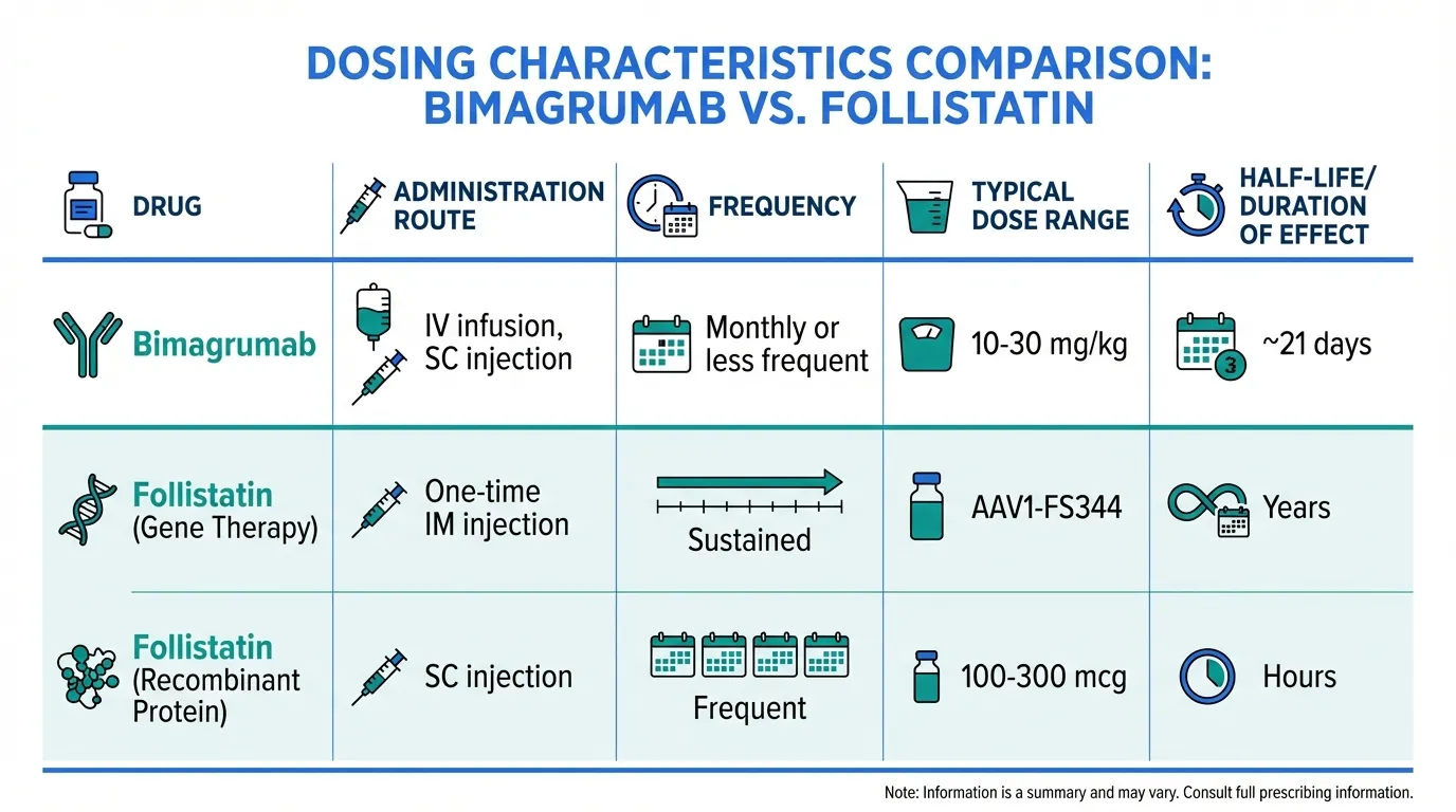 | Dosing and Administration | Intravenous infusion or subcutaneous injection. Phase 2 trials used monthly IV infusions (10 mg/kg). Long half-life of antibody enables infrequent dosing. Standardized pharmaceutical production. | Gene therapy (AAV injection, one-time intramuscular) or recombinant protein (subcutaneous injection, research-only). No standardized dosing protocols. Gene therapy is irreversible; recombinant protein requires frequent dosing due to short half-life. | Bimagrumab |