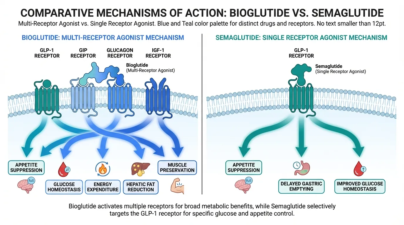 - Receptor targets: Bioglutide activates 4 receptors (GLP-1/GIP/glucagon/IGF-1); semaglutide activates 1 (GLP-1)