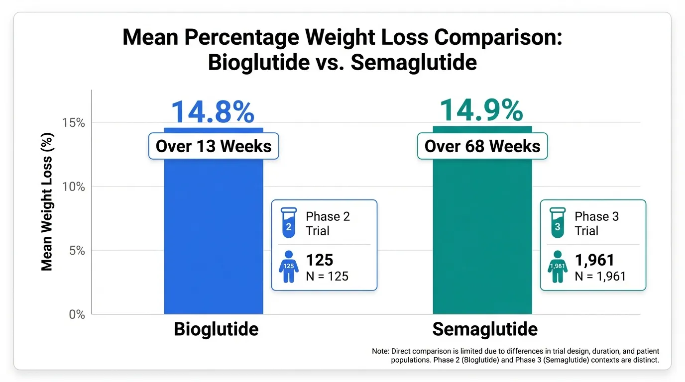 Critical caveat: Bioglutide achieved comparable weight loss to semaglutide in 13 weeks versus 68 weeks, which if sustained would represent dramatically superior efficacy. However, 13-week Phase 2 data in 125 patients cannot be meaningfully compared to 68-week Phase 3 data in 1,961 patients. Early-phase weight loss trajectories frequently do not extrapolate linearly, and many promising Phase 2 results have failed to replicate in Phase 3.