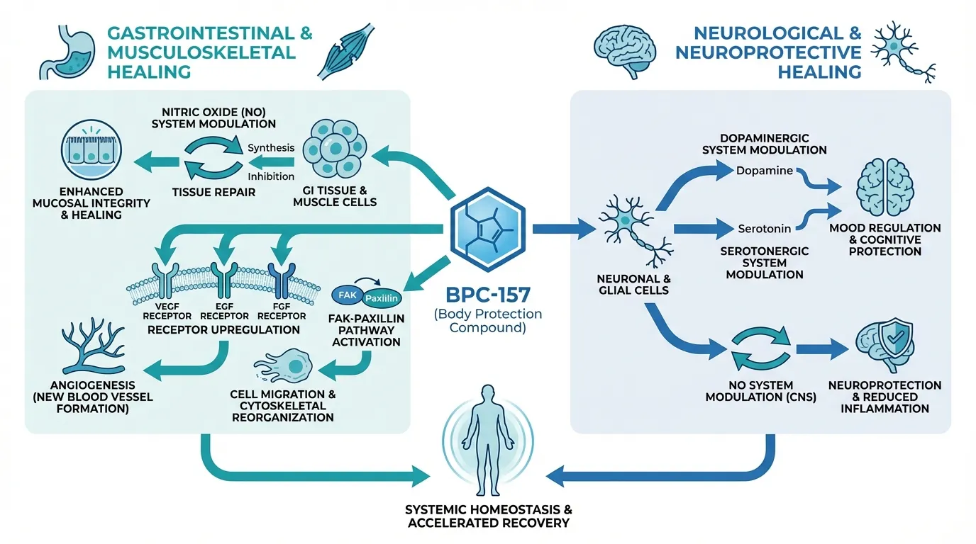 BPC-157 (Body Protection Compound-157) exerts its healing effects through multiple interconnected pathways. Central to its mechanism is the modulation of the nitric oxide (NO) system, where it can either promote or inhibit NO synthesis depending on tissue context. This bidirectional NO modulation contributes to its vascular protective effects.