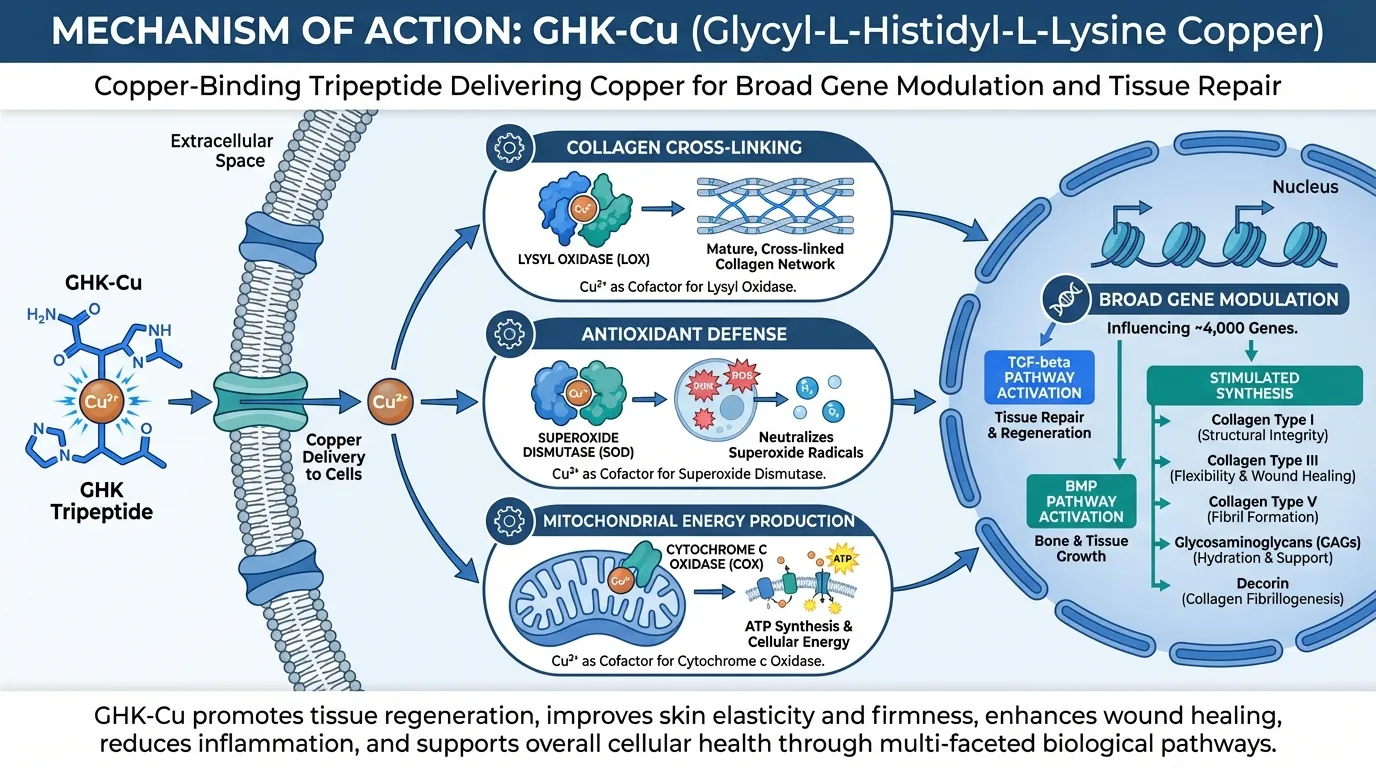 GHK-Cu (glycyl-L-histidyl-L-lysine:copper(II)) functions primarily through its copper-chelating properties and broad gene-modulatory effects. Research has identified that GHK-Cu modulates approximately 4,000 human genes, representing roughly 6% of the human genome. Many of these genes are involved in tissue remodeling, inflammation, and cellular defense mechanisms.
