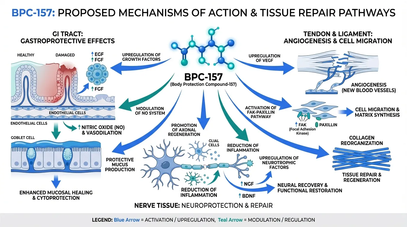 BPC-157 is a synthetic pentadecapeptide derived from a protective protein in human gastric juice. Its proposed mechanisms involve multiple cytoprotective pathways including upregulation of VEGF and growth factors promoting angiogenesis, modulation of the nitric oxide system, activation of the FAK-paxillin pathway for cell migration and tissue repair, interaction with the gut-brain axis affecting dopaminergic and serotonergic systems, and gastroprotective effects against NSAID and alcohol-induced mucosal damage. BPC-157 is notably stable in gastric acid, unusual for a peptide.