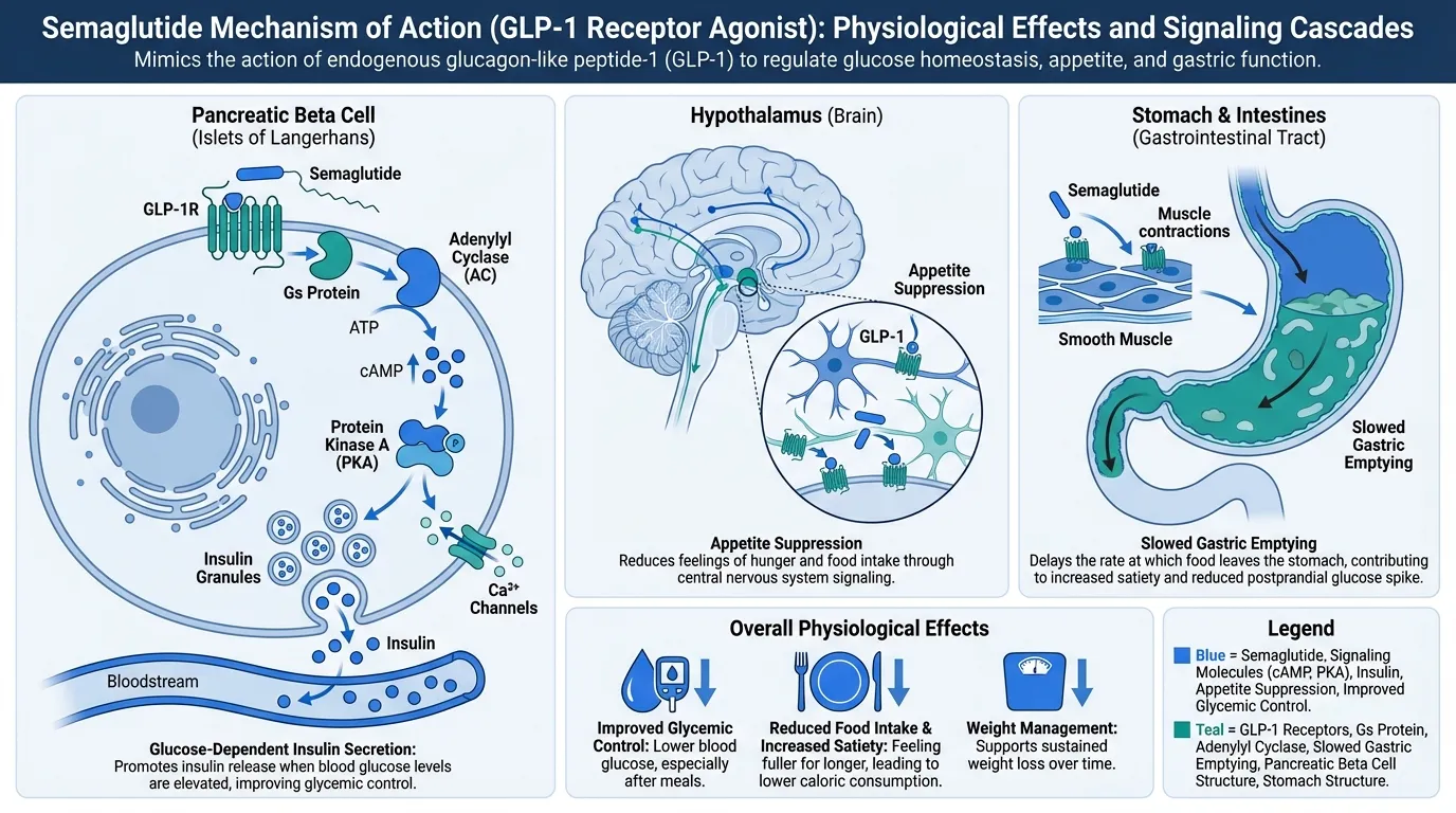 Semaglutide: GLP-1 receptor agonist activating Gs-cAMP-PKA signaling for glucose- dependent insulin secretion, central appetite suppression, and delayed gastric emptying; C18 fatty diacid enables weekly dosing