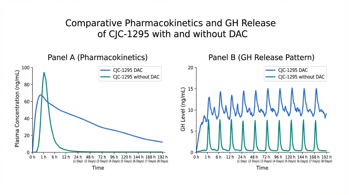 CJC-1295 DAC vs No DAC compared: long-acting weekly dosing vs pulsatile GH release, pharmacokinetics, and research evidence.
