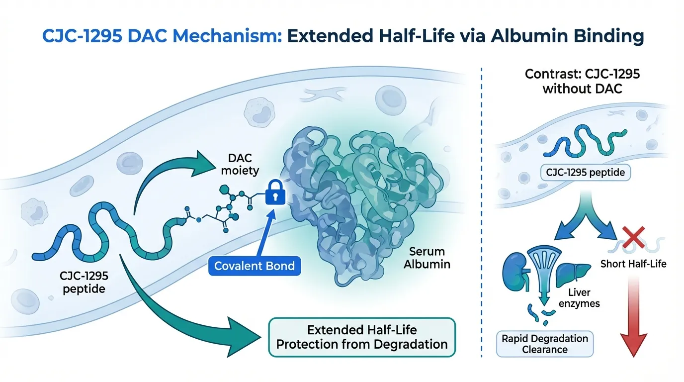 CJC-1295 DAC is a 30-amino acid synthetic analog of GHRH that incorporates the Drug Affinity Complex, a maleimido derivative of lysine that forms a covalent bond with serum albumin after subcutaneous injection. This albumin conjugation protects the peptide from DPP-IV degradation and reduces renal clearance, extending the half-life from minutes to 6-8 days.