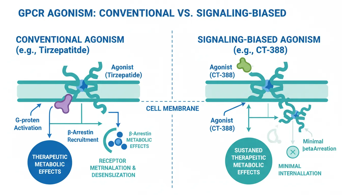The significance of this design lies in receptor biology. Most GPCR agonists trigger two downstream pathways: G-protein signaling (which mediates the therapeutic metabolic effects) and beta-arrestin recruitment (which causes receptor internalization and desensitization). By biasing toward G-protein signaling, CT-388 reduces the rate of receptor downregulation, potentially sustaining pharmacological activity between doses.