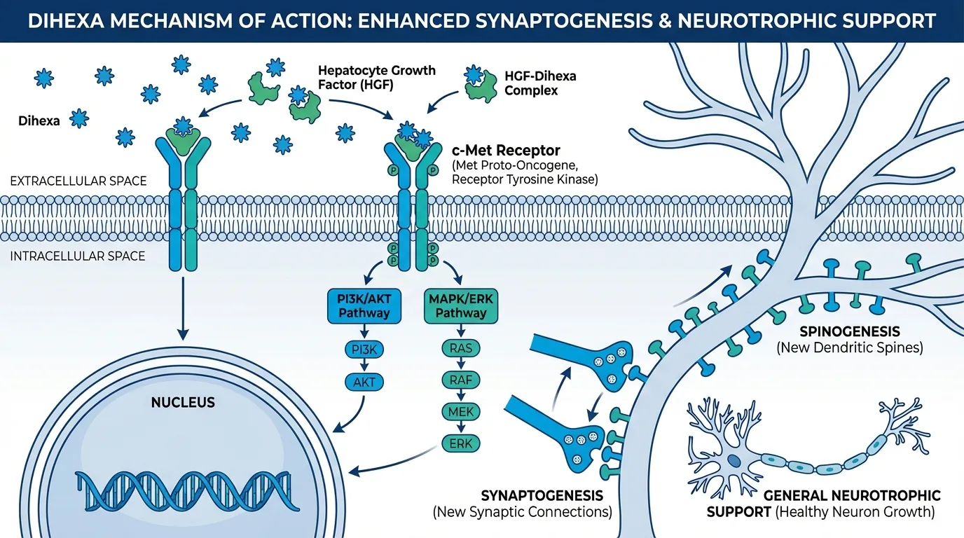 The mechanism centers on hepatocyte growth factor (HGF) and its receptor c-Met. Dihexa binds to HGF with high affinity and potentiates HGF's ability to activate c-Met at concentrations far below normal thresholds. The downstream effects include: