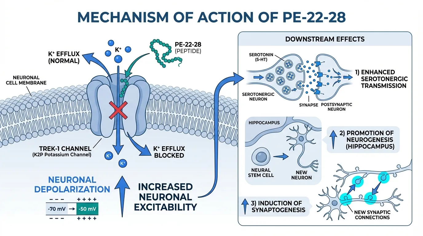 The mechanism centers on TREK-1, a two-pore domain potassium (K2P) channel widely expressed in the central nervous system. TREK-1 channels are "leak" channels that maintain resting membrane potential and regulate neuronal excitability. By blocking TREK-1, PE-22-28: