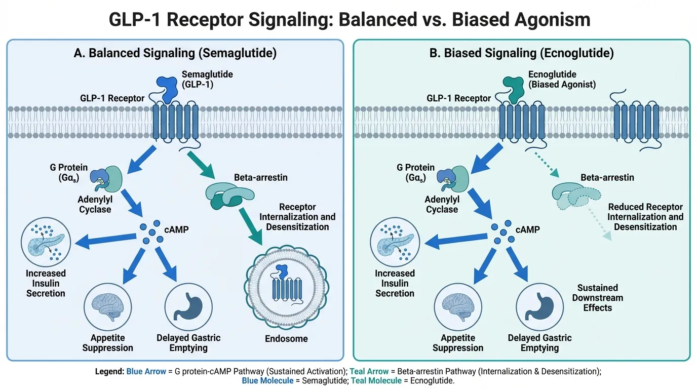 - Signaling bias: Ecnoglutide is cAMP-biased; semaglutide has balanced signaling