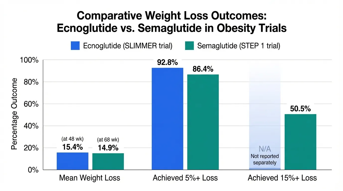 Evidence-based comparison of ecnoglutide (cAMP-biased GLP-1 agonist) and semaglutide (selective GLP-1 agonist), including SLIMMER Phase 3, STEP, and SELECT trial data.