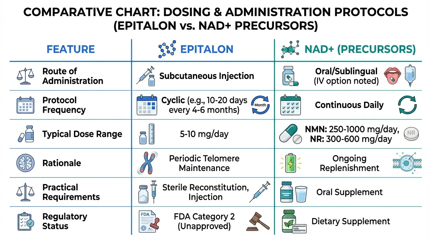 The practical accessibility difference is dramatic. NAD+ precursors can be purchased and consumed like any supplement. Epitalon requires sourcing a research peptide, reconstituting under sterile conditions, and self-administering injections -- a process that became more difficult after FDA Category 2 placement.