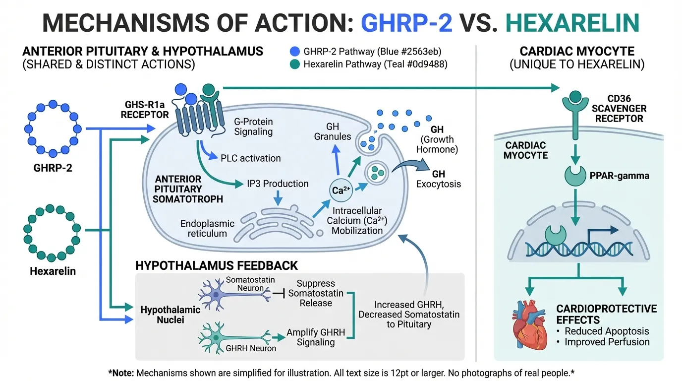 Hexarelin shares the core GHS-R1a mechanism with GHRP-2, activating pituitary somatotrophs to release stored GH through calcium-dependent exocytosis. At the hypothalamic level, Hexarelin similarly suppresses somatostatin tone and enhances GHRH neuronal activity. However, Hexarelin consistently produces the largest GH release of any synthetic GHS studied in human clinical trials, with peak GH levels exceeding those achieved by GHRP-2, GHRP-6, or ipamorelin at comparable doses.