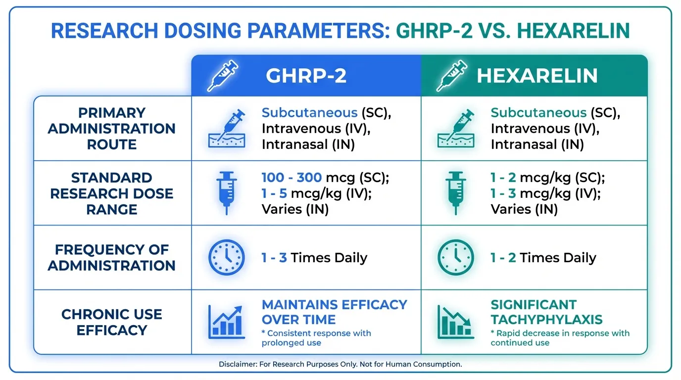 GHRP-2 and Hexarelin represent two closely related but pharmacologically distinct growth hormone secretagogues. For research requiring sustained GH augmentation over extended periods, GHRP-2 offers clear advantages through its resistance to desensitization, minimal appetite effects, and regulatory validation in Japan. Its well-characterized pharmacokinetic profile and synergy with GHRH analogs make it the more practical choice for long-term investigational protocols.