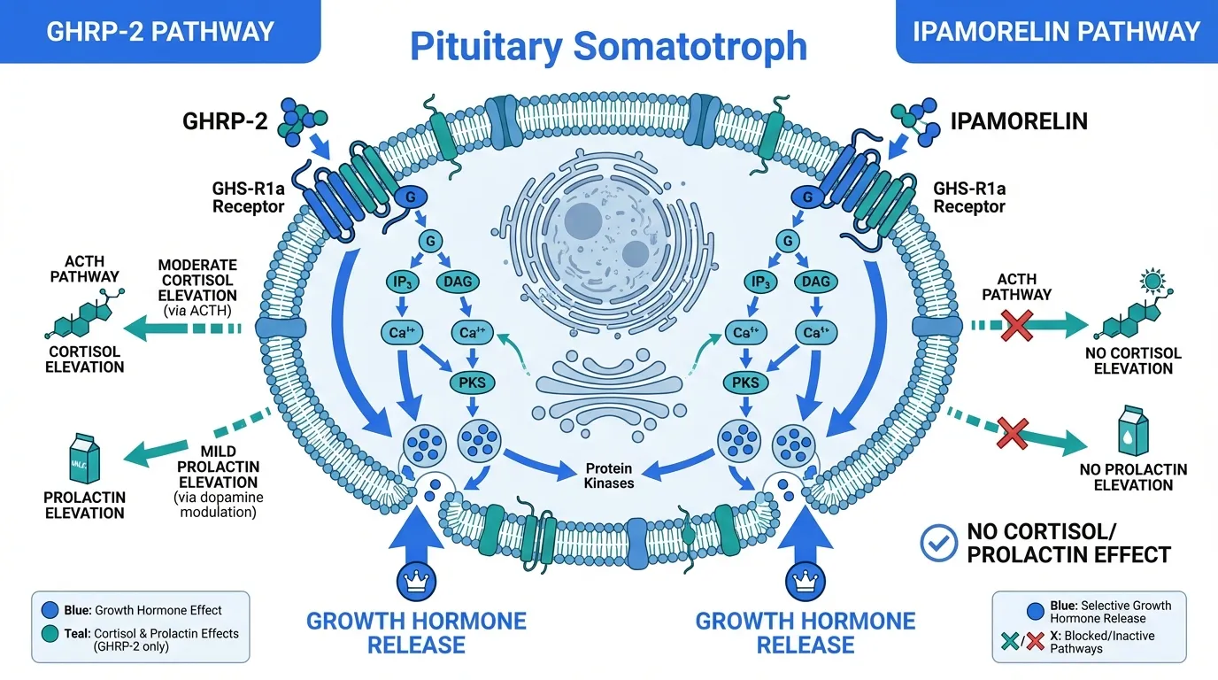 Ipamorelin produces GH release without significantly elevating cortisol, prolactin, or ACTH, making it the cleanest GHS option for research requiring isolated GH stimulation
