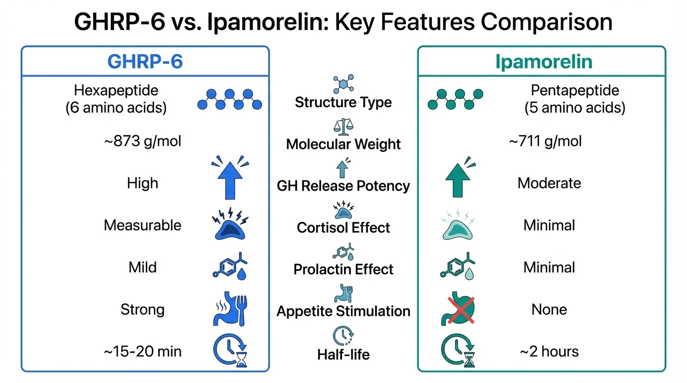 Explore the full profiles of GHRP-6 and Ipamorelin. For related comparisons, see GHRP-2 vs Ipamorelin and our comprehensive Growth Hormone Secretagogues Compared guide.