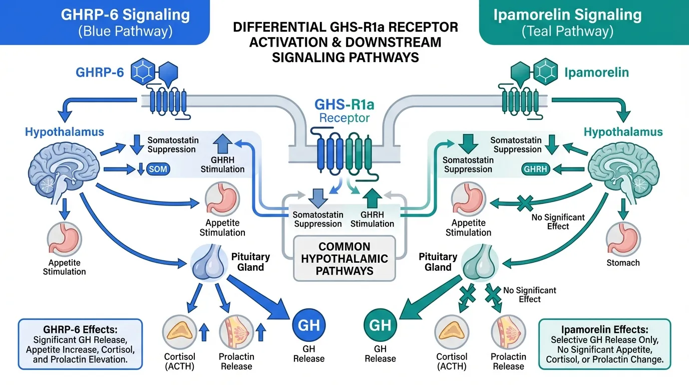This selectivity appears to arise from ipamorelin's specific receptor-binding conformation. While GHRP-6 activates GHS-R1a broadly across multiple tissue types with varying downstream consequences, ipamorelin's interaction with the receptor appears to favor the conformational state that drives somatotroph GH release without efficiently engaging the receptor conformations responsible for appetite stimulation or ACTH release.