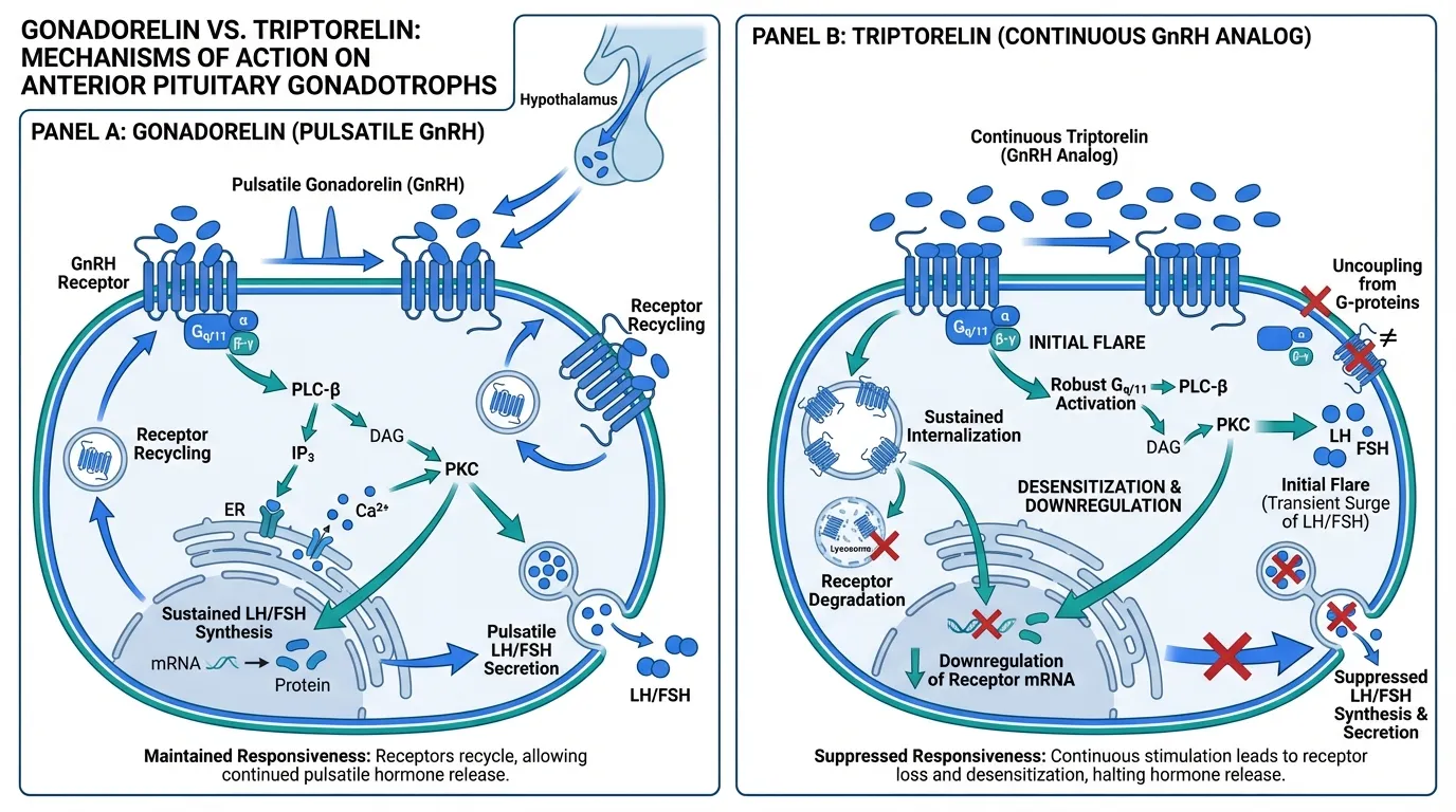 Gonadorelin and triptorelin both act on the GnRH receptor, yet they produce diametrically opposite clinical outcomes. Gonadorelin, identical to native GnRH, stimulates LH and FSH release to support reproductive function. Triptorelin, a modified GnRH analog with enhanced stability, produces initial stimulation followed by sustained pituitary desensitization that suppresses gonadal hormones to castrate levels.