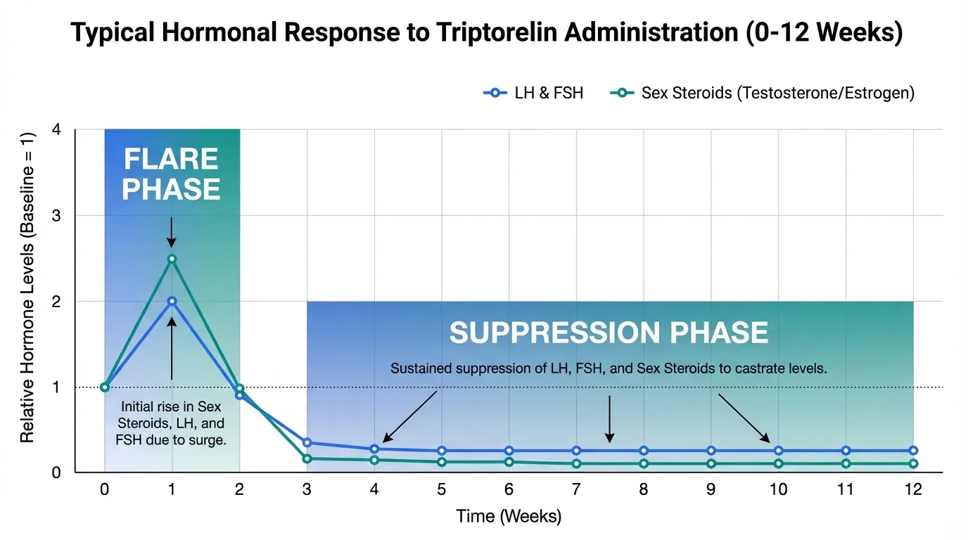 Phase 1 (Flare, weeks 1-2): Initial receptor activation produces robust LH and FSH secretion, temporarily increasing sex steroids. Testosterone may rise 50-100% above baseline in men during this period.