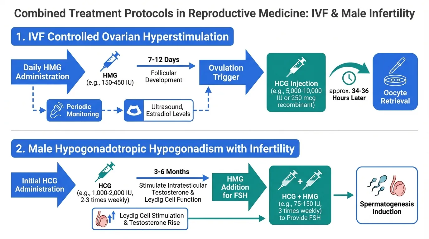 HCG and HMG are routinely used together in reproductive medicine. The most common protocol involves HMG for ovarian stimulation (providing FSH and LH for follicular growth) followed by a single HCG injection as the ovulation trigger (providing the LH surge for final oocyte maturation). This sequential combination is the foundation of most IVF protocols.