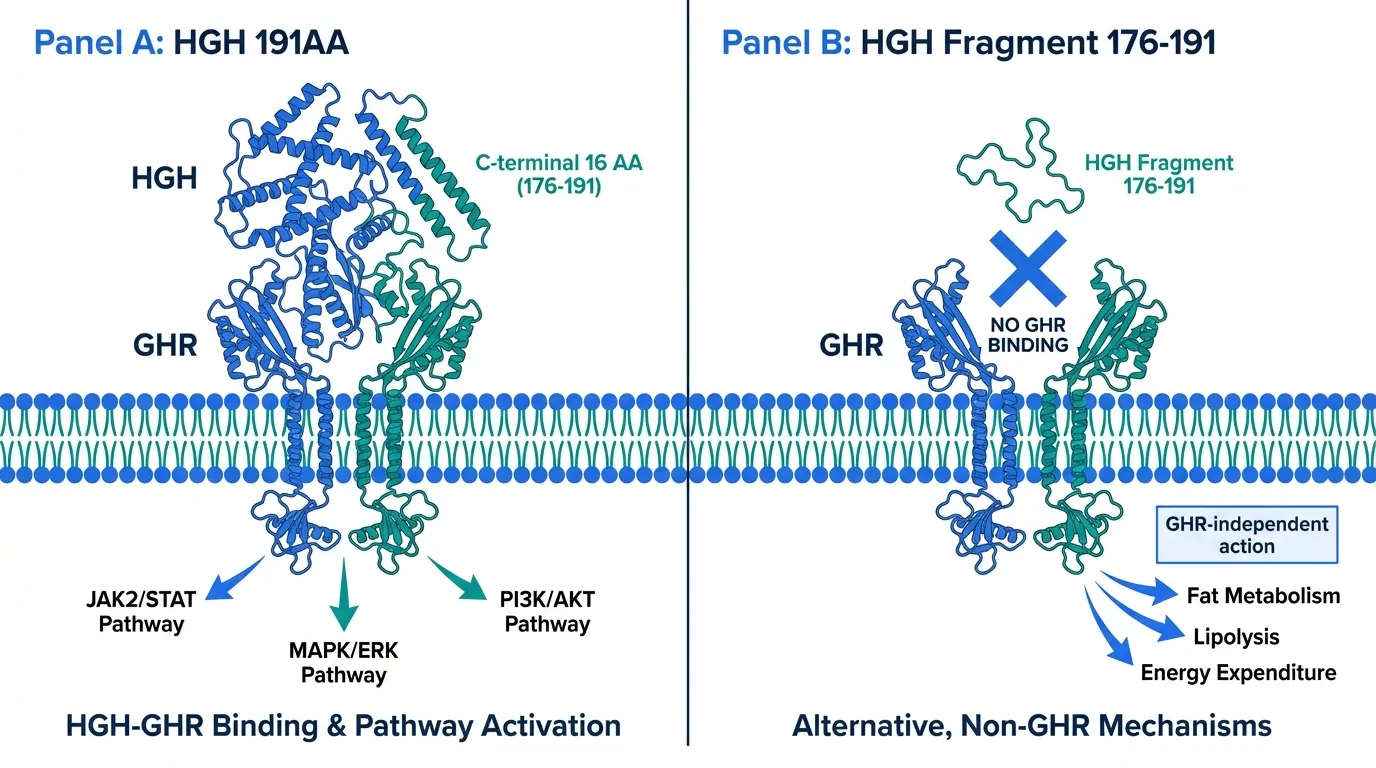 HGH 191AA and HGH Fragment 176-191 share a direct structural relationship: the fragment is literally the last 16 amino acids of the full 191-amino acid growth hormone protein. Yet they represent fundamentally different pharmacological approaches. Full-length HGH 191AA binds the growth hormone receptor and activates the full spectrum of GH signaling, producing effects on growth, metabolism, body composition, and organ function. The fragment, by contrast, retains only the lipolytic activity encoded in the C-terminal region while lacking the ability to activate GH receptor signaling.