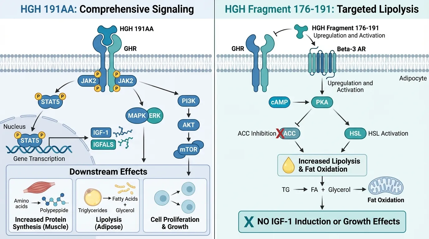 | Mechanism of Action | Full 191-amino acid somatotropin that binds the GH receptor and activates JAK2-STAT5, ERK, and PI3K/AKT pathways; drives IGF-1 production, growth, lipolysis, and anabolic signaling across multiple tissues | 16-amino acid C-terminal fragment of GH that does not bind the GH receptor; selectively promotes lipolysis and inhibits lipogenesis via beta-3 adrenergic and HSL/ACC pathways without growth or IGF-1 effects | HGH 191AA |