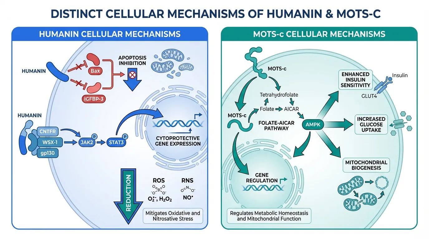 Humanin is primarily a cytoprotective peptide that prevents programmed cell death (apoptosis) through JAK/STAT signaling and direct interaction with pro-apoptotic proteins. MOTS-c is primarily a metabolic regulator that activates AMPK and enhances insulin sensitivity, functioning as an endogenous exercise mimetic. Together, they represent two arms of mitochondrial communication with the rest of the cell and the organism.