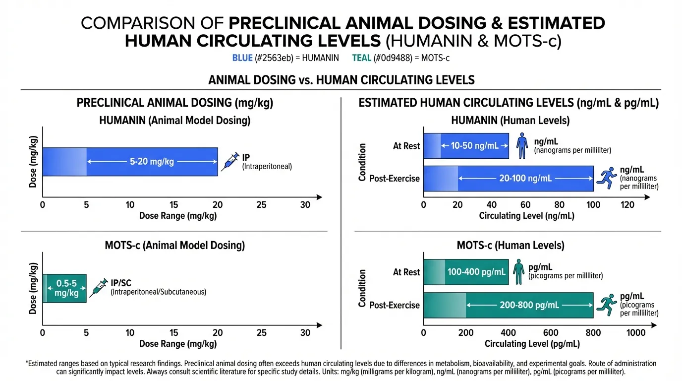 - Native humanin: Circulating levels in humans are approximately 0.5-2 ng/mL, declining with age