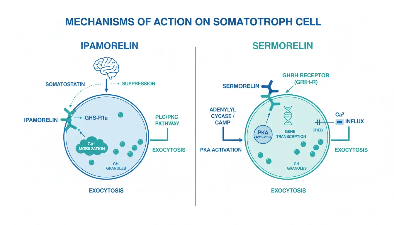 - Complementary signaling: Sermorelin activates cAMP/PKA while ipamorelin activates PLC/PKC, and both pathways converge on calcium mobilization for GH exocytosis