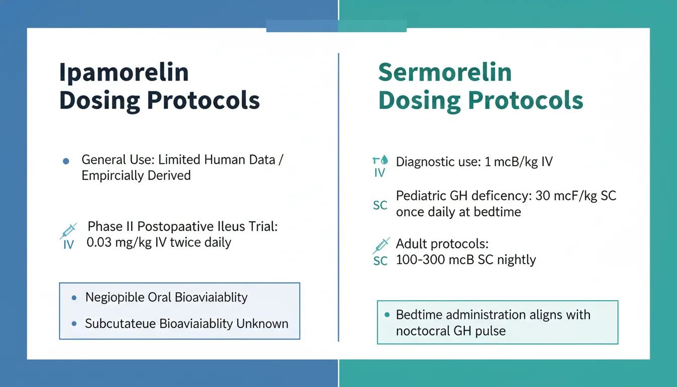 | Dosing Complexity | Typically studied at fixed doses via IV in clinical trials. No established human SC bioavailability data. Half-life approximately 2 hours IV. Dosing protocols are largely empirical. | Well-established dosing from FDA approval. Pediatric 30 mcg/kg SC at bedtime. Adult protocols typically 100-300 mcg SC nightly. Diagnostic dose 1 mcg/kg IV. Clear clinical guidance available. | Sermorelin |