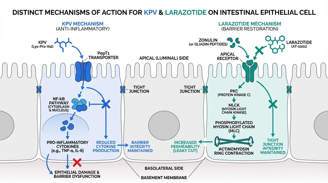 KPV and Larazotide represent two fundamentally different strategies for addressing gut barrier dysfunction. KPV, a tripeptide derived from alpha-melanocyte-stimulating hormone, attacks the problem from the inflammatory side -- suppressing the NF-kB-driven cytokine cascade that damages intestinal epithelium. Larazotide (AT-1001), a synthetic octapeptide, takes the structural approach -- directly blocking zonulin-mediated opening of tight junctions to maintain paracellular barrier integrity.