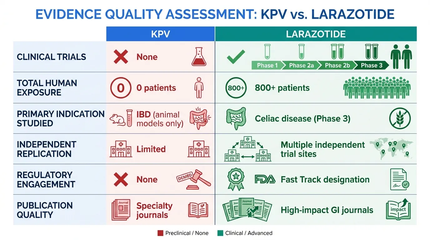 - Evidence tier: Larazotide has Phase 3 clinical data. KPV has only preclinical data.