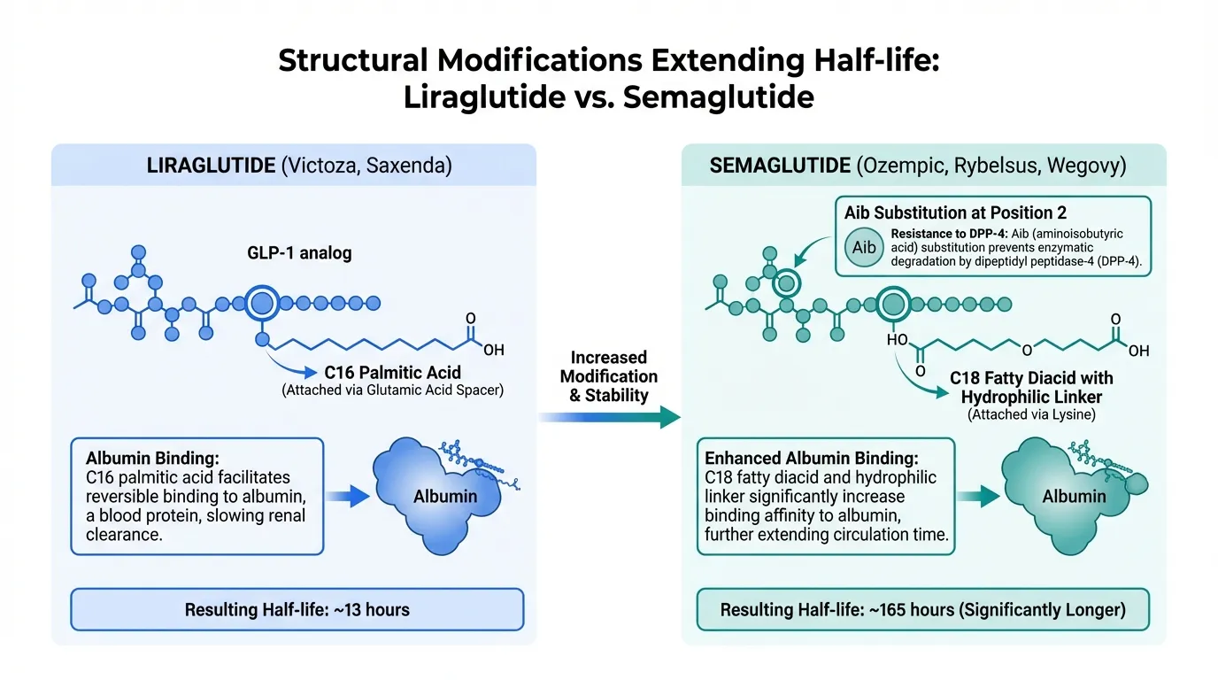 Semaglutide's longer half-life results from three structural modifications: an aminoisobutyric acid (Aib) substitution at position 2 that confers DPP-4 resistance, a C18 fatty diacid (vs C16 in liraglutide) that strengthens albumin binding, and a hydrophilic linker that optimizes the fatty acid orientation. These changes produce a 12-fold increase in half-life compared to liraglutide.