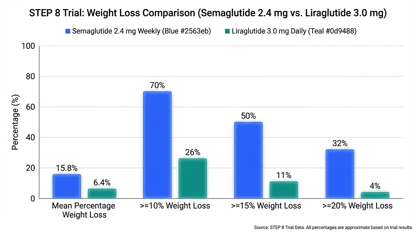 The STEP 8 head-to-head data eliminates confounders inherent in cross-trial comparisons and definitively establishes semaglutide's superiority in this population.
